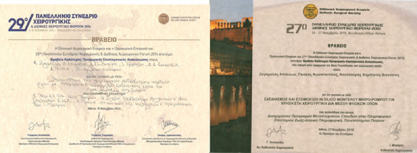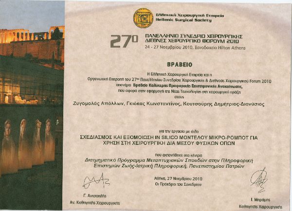 Βραβείο Καλύτερης Επιστημονικής Ανακοίνωσης που αφορά στην εφαρμογή της Νέας Τεχνολογίας στη χειρουργική πράξη στο 27ο Πανελλήνιο Χειρουργικό Συνέδριο για την μελέτη "ΣΧΕΔΙΑΣΜΟΣ ΚΑΙ ΕΞΟΜΟΙΩΣΗ ΙN SILIKO ΜΟΝΤΕΛΟΥ ΜΙΚΡΟ-ΡΟΜΠΟΤ ΓΙΑ ΧΡΗΣΗ ΣΤΗ ΧΕΙΡΟΥΡΓΙΚΗ ΔΙΑ ΜΕΣΟΥ ΦΥΣΙΚΩΝ ΟΠΩΝ"