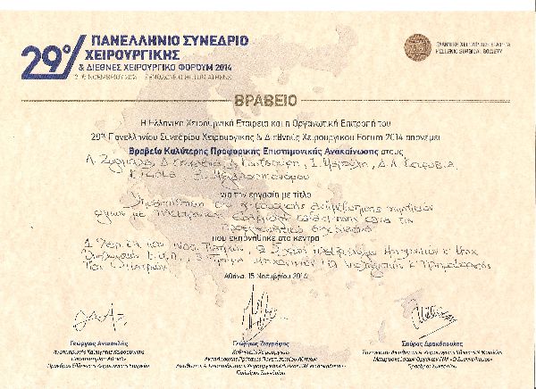 Βραβείο Καλύτερης Επιστημονικής Ανακοίνωσης στο 29ο Πανελλήνιο Χειρουργικό συνέδριο για την μελέτη "ΥΠΟΒΟΗΘΗΣΗ ΤΗΣ ΧΕΙΡΟΥΡΓΙΚΗΣ ΑΝΤΙΜΕΤΩΠΙΣΗΣ ΗΠΑΤΙΚΩΝ ΟΓΚΩΝ ΜΕ ΗΛΕΚΤΡΟΝΙΚΗ ΕΦΑΡΜΟΓΗ ΚΑΤΑΤΜΗΣΗΣ ΚΑΤΑ ΤΟΝ ΠΡΟΕΓΧΕΙΡΗΤΙΚΟ ΣΧΕΔΙΑΣΜΟ"