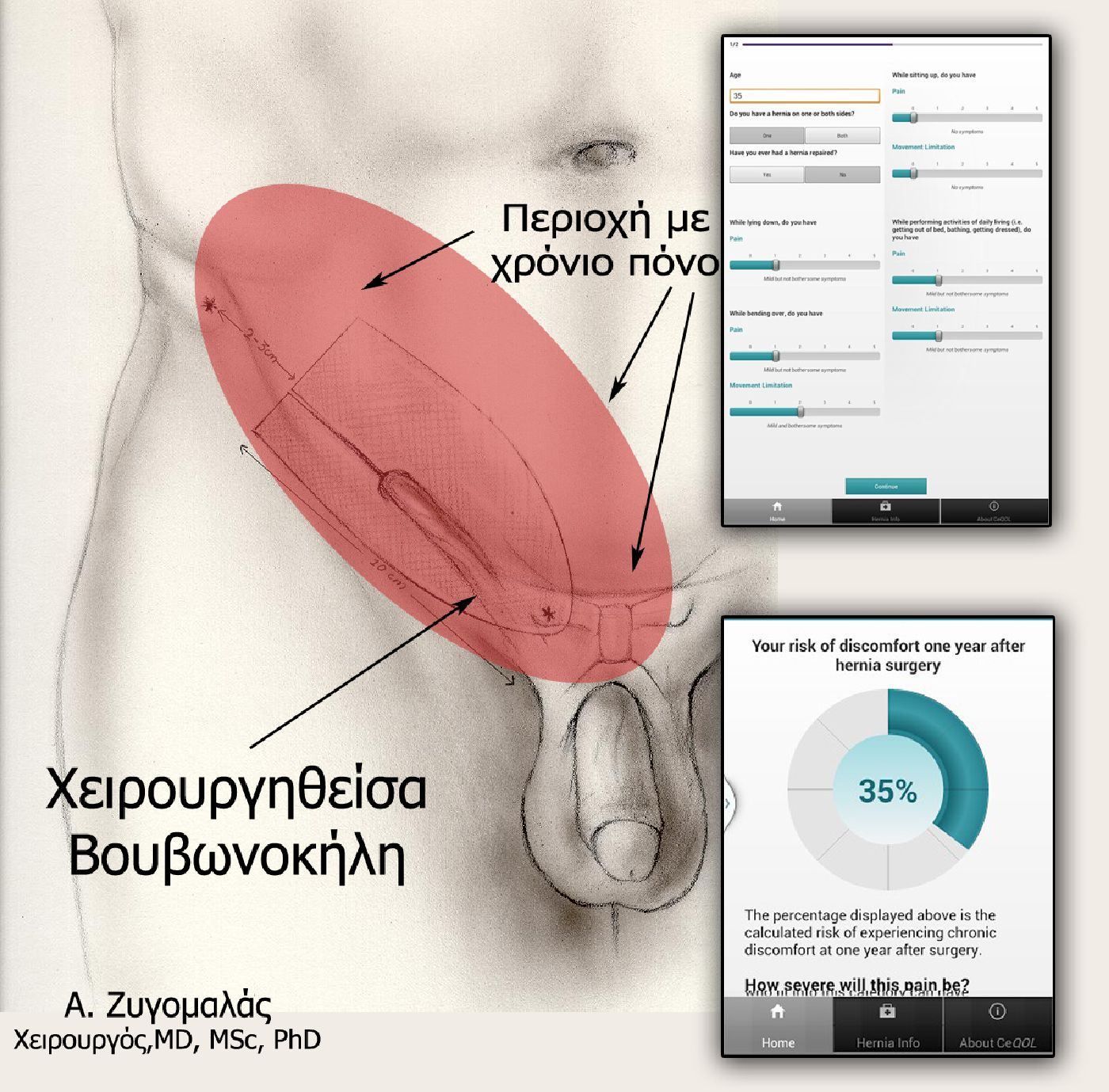 Διάφορες μελέτες έχουν δείξει ότι περίπου 1 στους 10 ασθενείς που χειρουργούνται για αποκατάσταση βουβωνοκήλης μπορεί να παρουσιάσει χρόνιο πόνο μετά την επέμβαση! Ερευνητές από το Carolinas Medical Center μελέτησαν πάνω από 2000 ασθενείς που χειρουργήθηκαν για βουβωνοκήλη, είτε με την κλασσική μέθοδο είτε λαπαροσκοπικά, και ανέπτυξαν μια πρωτότυπη ηλεκτρονική εφαρμογή για τον υπολογισμό της πιθανότητας εμφάνισης χρόνιου πόνου μέσα στο πρώτο χρόνο από την επέμβαση. Η χρησιμότητα της νέας αυτής ηλεκτρονικής εφαρμογής έγκειται στην αναγνώριση των ασθενών με υψηλό κίνδυνο για εμφάνιση χρόνιου πόνου, έτσι ώστε να αντιμετωπιστούν έγκαιρα και εξατομικευμένα από ομάδα ειδικών ιατρών. Η αντίληψη του πόνου είναι γενικά πολύ υποκειμενική και εξαρτάται από πολλούς παράγοντες. Παρόλα αυτά, ο καλός προεγχειρητικός σχεδιασμός, η κατάλληλη χειρουργική τεχνική και η εξατομικευμένη μετεγχειρητική φροντίδα και καθοδήγηση του ασθενούς συμβάλλουν στη μείωση της πιθανότητας για εμφάνιση χρόνιου πόνου μετά από επέμβαση αποκατάστασης βουβωνοκήλης.