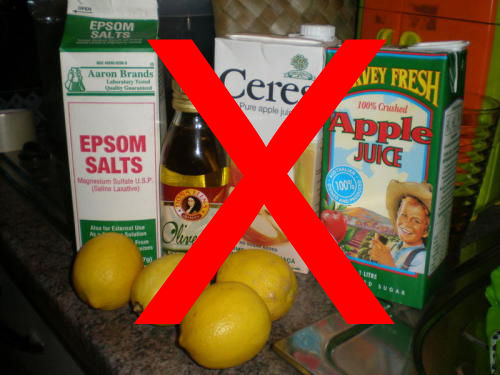 Τραγικός μύθος και παραπληροφόρηση δυστυχώς από πολλά μη ιατρικά περιοδικά και ιστοσελίδες. Αναφέρεται σε ειδική δίαιτα όπου οι ασθενείς νηστικοί πίνουν χυμούς μύλου, τσάι και στη συνέχεια “ξεπλένουν” τη χοληδόχο κύστη τους πίνοντας λάδι και χυμό λεμονιού. Αρκετοί ασθενείς στη συνέχεια αναφέρουν ότι βλέπουν στα κόπρανά τους πρασινωπές πέτρες, θεωρώντας ότι έτσι αφαιρούνται οι πέτρες από τη χοληδόχο κύστη! Η χημική ανάλυση όμως αυτών των λίθων δείχνει ότι ουδεμία σχέση έχουν με τους λίθους που αναπτύσσονται στη χοληδόχο κύστη. Αυτοί οι λίθοι στα κόπρανα αποτελούνται από συμπυκνωμένο λάδι μέσω μιας χημικής αντίδρασης σαπωνοποίησης όπως ονομάζεται, μεταξύ του λαδιού και των χυμών και ηλεκτρολυτών στο λεμόνι. Το χειρότερο όμως είναι ότι ο συνδυασμός νηστείας και υπερβολικής χρήσης λιπαρών από το λάδι μπορεί να πυροδοτήσει κρίση κολικού χοληφόρων και λοιπές επιπλοκές στους ασθενείς!